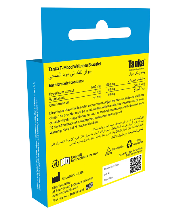 צמידי הבריאות T-Mood מבית Tanka מכילים שמן קמומיל, שמן ולריאן ותמצית היפריקום (Hypericum). במציאות לחוצה כמו שלנו, רבים מאיתנו מתמודדים עם מתח, חרדה וחוסר שקט. בדיוק לשם כך פותחו צמידי T-Mood המכילים רכיבים טבעיים הידועים בתכונותיהם המרגיעות. הצמידים מציעים פתרון טבעי ונוח שעוזר: להפחתת מתח וחרדה , לשינה איכותית יותר , לשיפור מצב הרוח ולהעלאת רמות האנרגיה ובכך מסייע בתפקוד היומיומי.